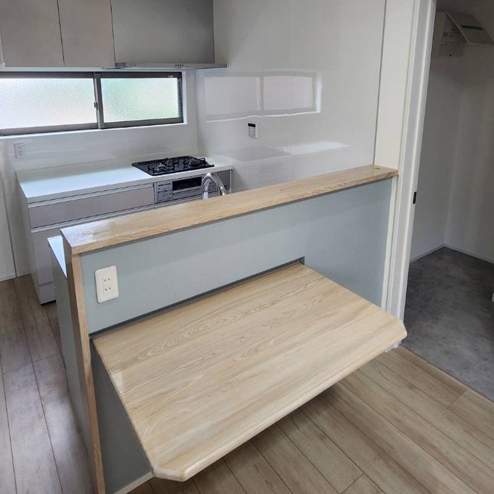 さらに、キッチン前には折りたたみ式のテーブルを設置し、食事や作業のほか、休日にはバーカウンターとしても活用可能。